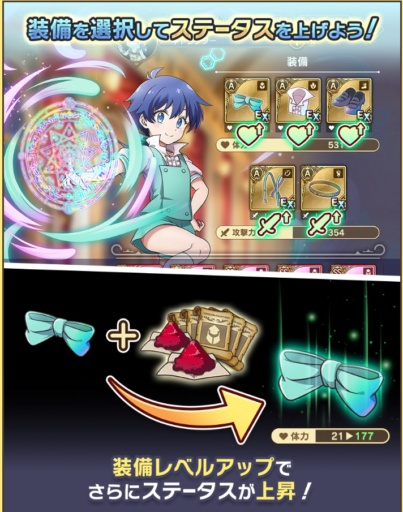 装備をレベルアップすることで「体力」や「攻撃力」のステータスが強化される。ステージに詰まった場合は装備を強化し、再度チャレンジしましょう。